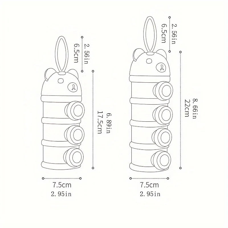 👶 Polyvalent & pratique Convient aussi bien au lait en poudre qu'aux céréales, fruits secs ou petits snacks. Compact et léger, il se glisse facilement dans n’importe quel sac à langer.